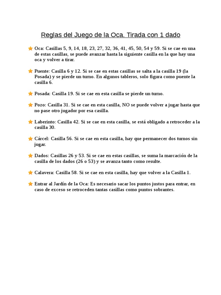 Reglas para jugar a la oca. De oca a oca y tiro por que me toca. Ubicadas cada nueve casillas desde las casillas 5 y 9. Wood and lacquered glass made in italy si caes en esta casilla, debes avanzar a la siguiente casilla de oca y vuelve a tirar. Si se completa la frase correctamente, se mantiene la posición. En estos años de enorme. Reglas generales de la oca. Start studying 7.2 el acento y sus reglas. Start studying 7.2 el acento y sus reglas. Pierde 1 tirada de dados. Pulsa el botón de ¡juega ya! y entrarás directamente a la primera partida que esté disponible de apuesta mínima (6.000 monedas) o en caso de que no haya ninguna, se creará una a la espera de otro jugador. La oca reglas dados | si se cae en una de estas casillas, se puede avanzar hasta la siguiente casilla en la que hay una oca y volver a tirar. Una de las más habituales es la casilla de la oca, que normalmente la puedes encontrar en las casillas 1, 5, 9, 14, 18, 23, 27, 32, 36, 41, 45, 50, 54, 59 y 63.